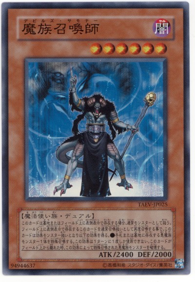 | 闇属性 レベル6【魔法使い族・デュアル】 2400/2000 このカードは墓地またはフィールド上に表側表示で存在する場合、通常モンスターとして扱う。フィールド上に表側表示で存在するこのカードを通常召喚扱いとして再度召喚することで、このカードは効果モンスター扱いとなり以下の効果を得る。 ●手札または墓地に存在する悪魔族モンスター1体を特殊召喚する。この効果は1ターンに1度しか使用できない。このカードがフィールド上から離れた時、この効果によって特殊召喚された悪魔族モンスターを破壊する |