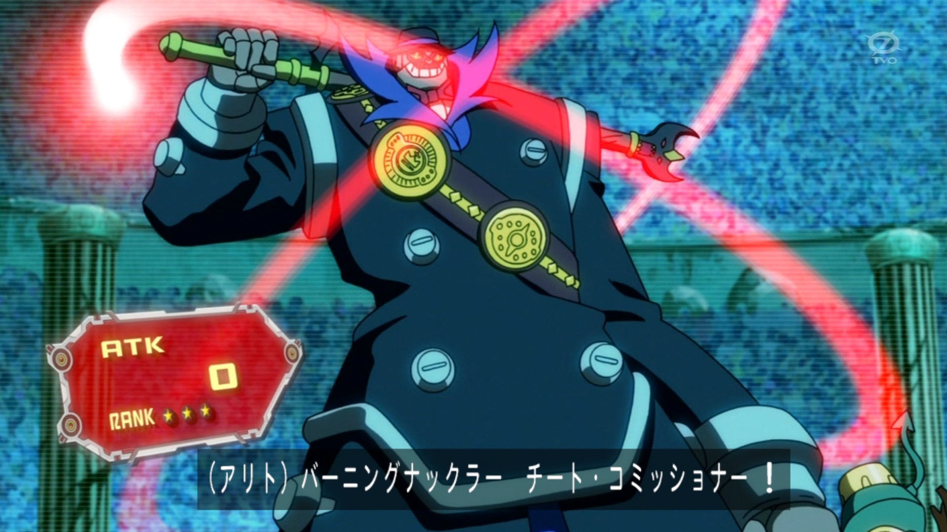 | 《BKチートコミッショナー》 レベル3×2 0/? このモンスターがバトルする時、フィールドの全てのモンスターは攻撃表示になる。フィールド上に味方モンスターが存在しているとき、自分フィールドモンスターと入れ替えることができる。このモンスター以外が戦闘を行うとき、ORUを全て消費し相手の手札に魔法カードがあればバトルを終了しその魔法カードを発動させる。 エクシーズ口上:すべては意のままに 黒き権威をまといて入場せよ!BKチートコミッショナー |