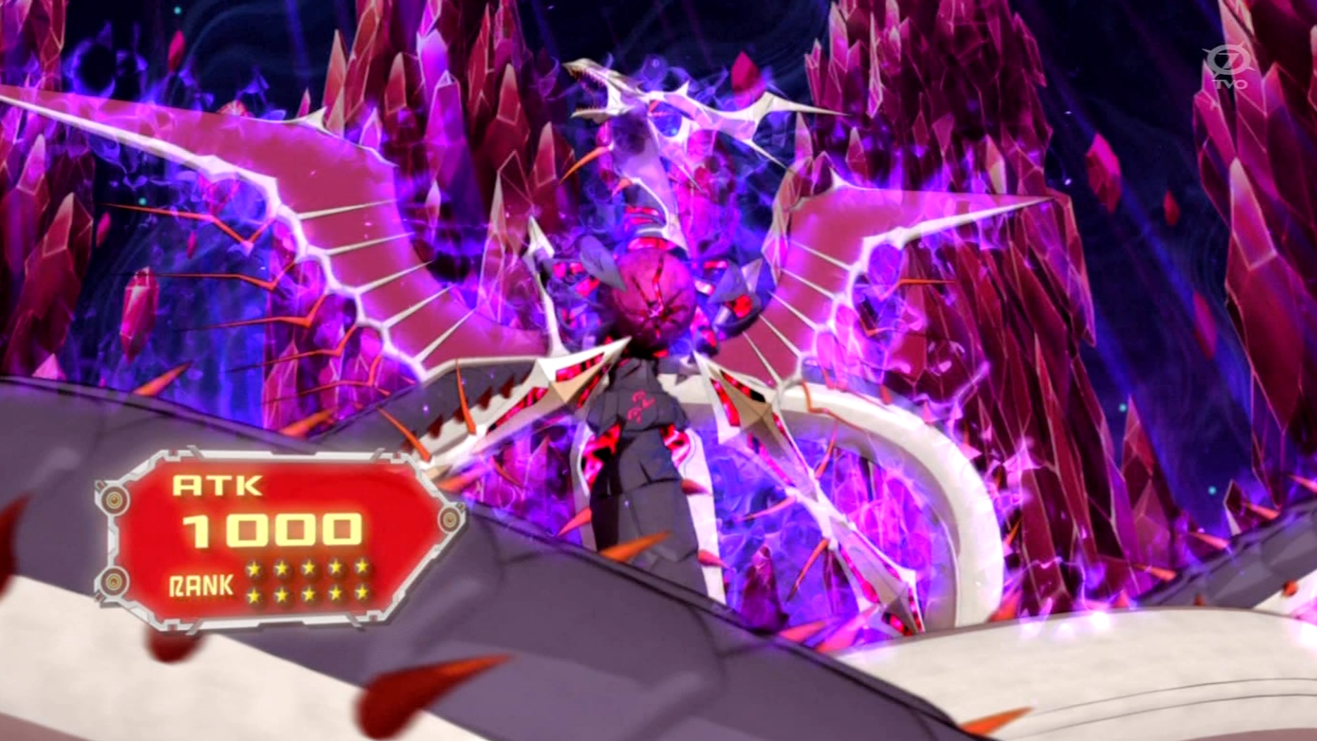 | 《CNo.92 偽骸虚龍 ハートアース・カオスドラゴン》 レベル10×4? 1000/? 1ターンに1度オーバーレイユニットを一つ取り除くことで、ターン終了時まで相手モンスター効果および魔法トラップカードの効果を無効にする。また、フィールド上にセットされたカードも発動できない。さらにこのターン相手プレイヤーに与えた戦闘ダメージの数値分ライフを回復する。 |