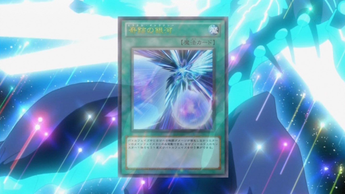 | 《奇跡の銀河》 バトルフェイズ中に自分への戦闘ダメージが発生しなかったターンのメインフェイズ2にのみ発動できる。自分フィールド上のモンスター1体でもう一度だけバトルフェイズを行うことができる |
