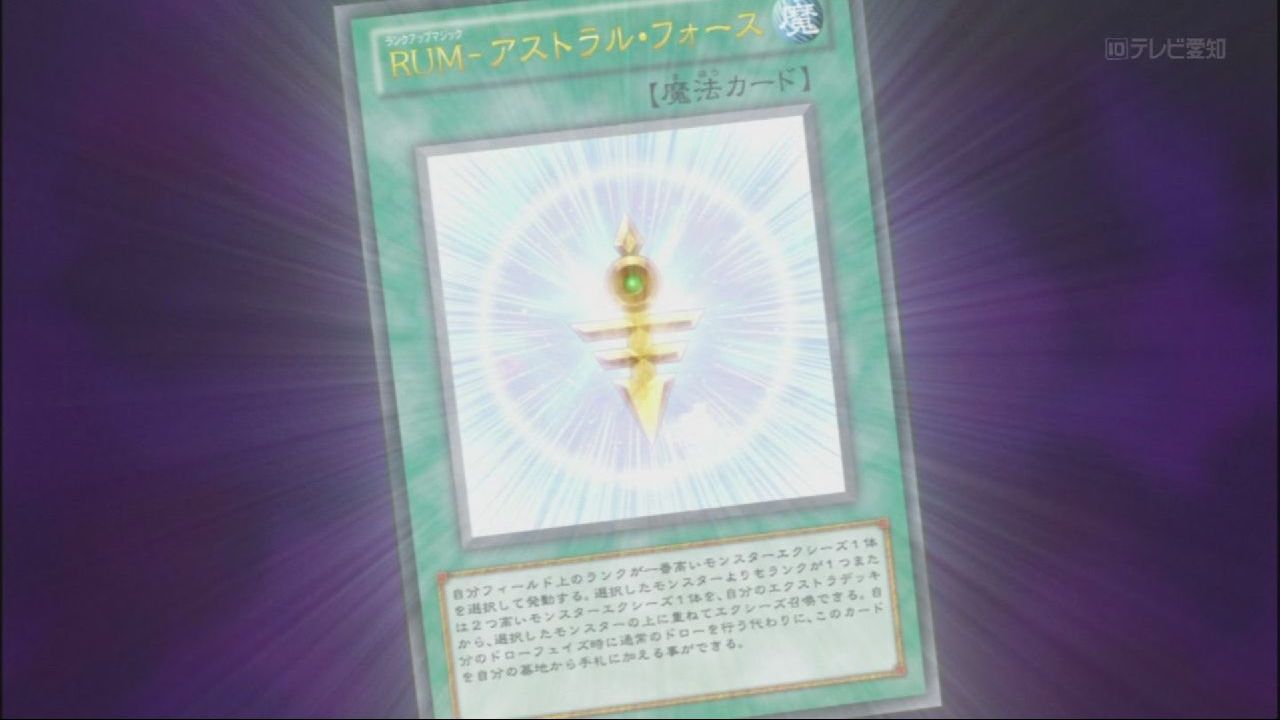 | 《RUM-アストラル・フォース》通常魔法 自分フィールド上のランクが一番高いモンスターエクシーズ1体を選択して発動する。選択したモンスターよりランクが1つまたは2つ高いモンスターエクシーズ1体を自分エクストラデッキから、選択したモンスターの上に重ねてエクシーズ召喚できる。自分のドローフェイズ時に通常のドローを行う代わりに、このカードを自分の墓地から手札に加えることができる |
