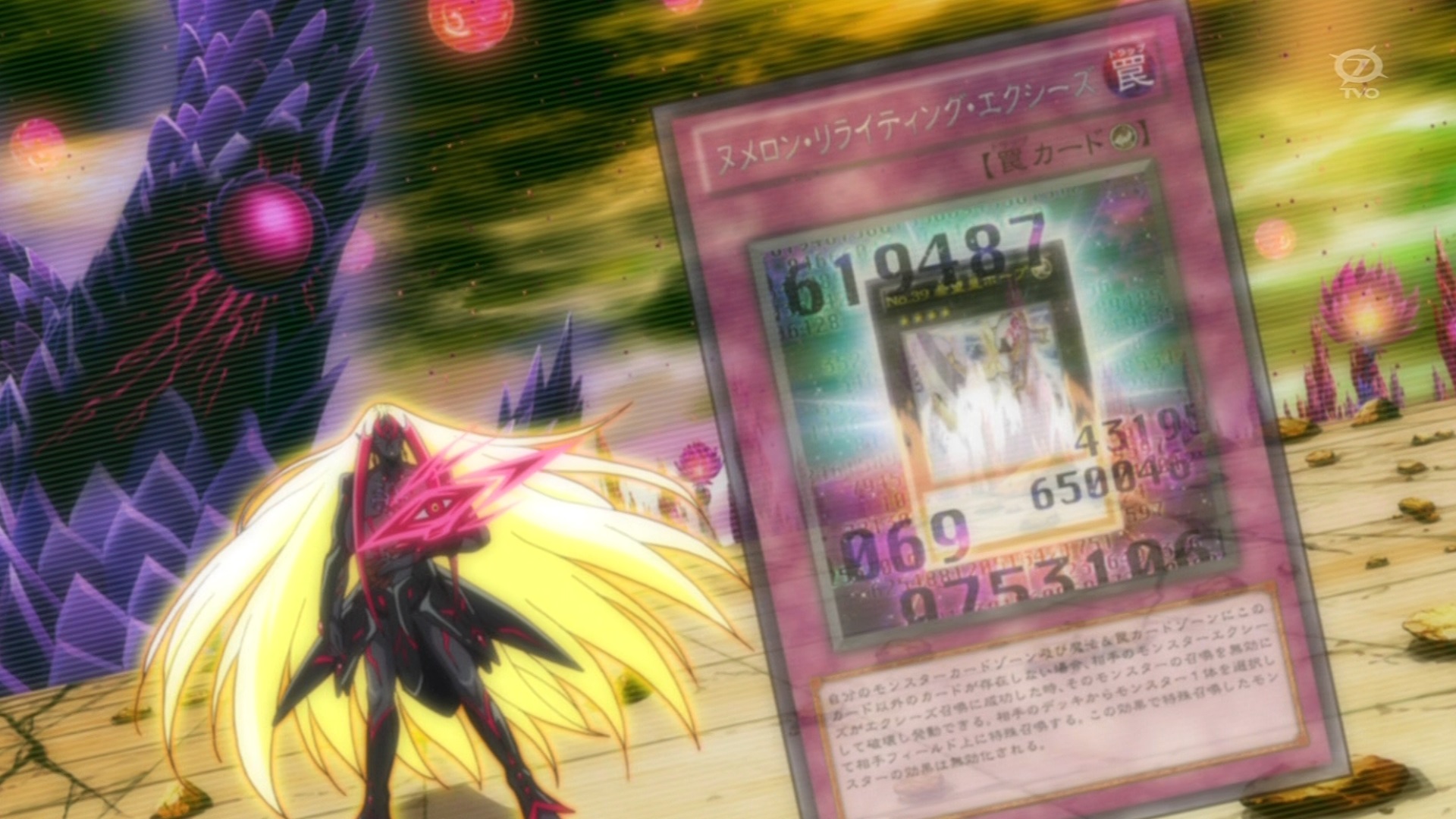 | 《ヌメロン・リライティング・エクシーズ》 カウンター罠 自分のモンスターカードゾーン及び魔法&罠カードゾーンにこのカード以外のカードが存在しない場合、相手のモンスターエクシーズがエクシーズ召喚に成功した時、そのモンスターの召喚を無効にして破壊し発動できる。相手のデッキからモンスター1体を選択して相手フィールド上に特殊召喚する。この効果で特殊召喚したモンスターの効果は無効化される。 |