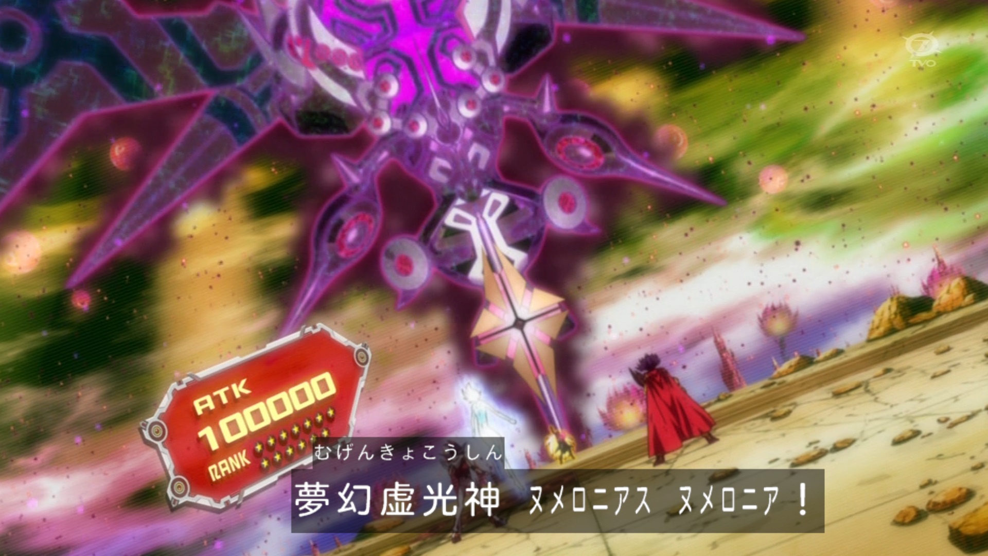 | 《CiNo.1000 夢幻虚光神ヌメロニアス・ヌメロニア》 レベル13×5 光属性 悪魔族 100000/100000 このカードは「No.」と名のつくモンスター以外との戦闘では破壊されない。自分フィールド上に存在する「CNo.1000 夢幻虚神ヌメロニアス」が破壊された時、そのカードをこのカードの下に重ねて、このカードを自分のエクストラデッキからエクシーズ召喚することができる。このカードはカードの効果では破壊されず、攻撃宣言をすることができない。このカードが自分フィールド上に存在する限り、相手はこのカードを攻撃対象に選択しなければならない。選択しなかったターンのエンドフェイズ時に、相手はデュエルに敗北する。このカードのエクシーズ素材1つを取り除いて発動することができる。相手モンスター1体の攻撃を無効にし、自分はその攻撃力分のライフポイントを回復する。 エクシーズ口上:降臨せよ!カオスイマジナリーナンバーズ1000!我が天は永し、地は久し・・・人のすがる夢は一場の幻に過ぎず・・・虚無の大神よ、闇をもて光に鉄槌を!夢幻虚光神ヌメロニアス・ヌメロニア! |
