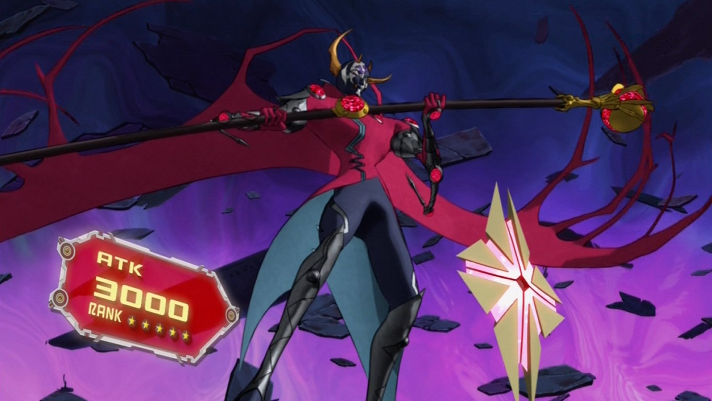 | 《CNo.104 仮面魔踏士(マスカレードマジシャン)アンブラル》 ランク5 3000/? 特殊召喚時、魔法罠ゾーンのカードを一枚破壊。 CORUを1つ取り除き、相手の手札1枚を墓地へ送りライフを半分にする。 エクシーズ口上:混沌より生まれしバリアンの力が光を覆うとき大いなる闇が舞い踊る 魔法罠破壊効果名:デストロイステップ 手札破壊効果名:ダークプランナー |